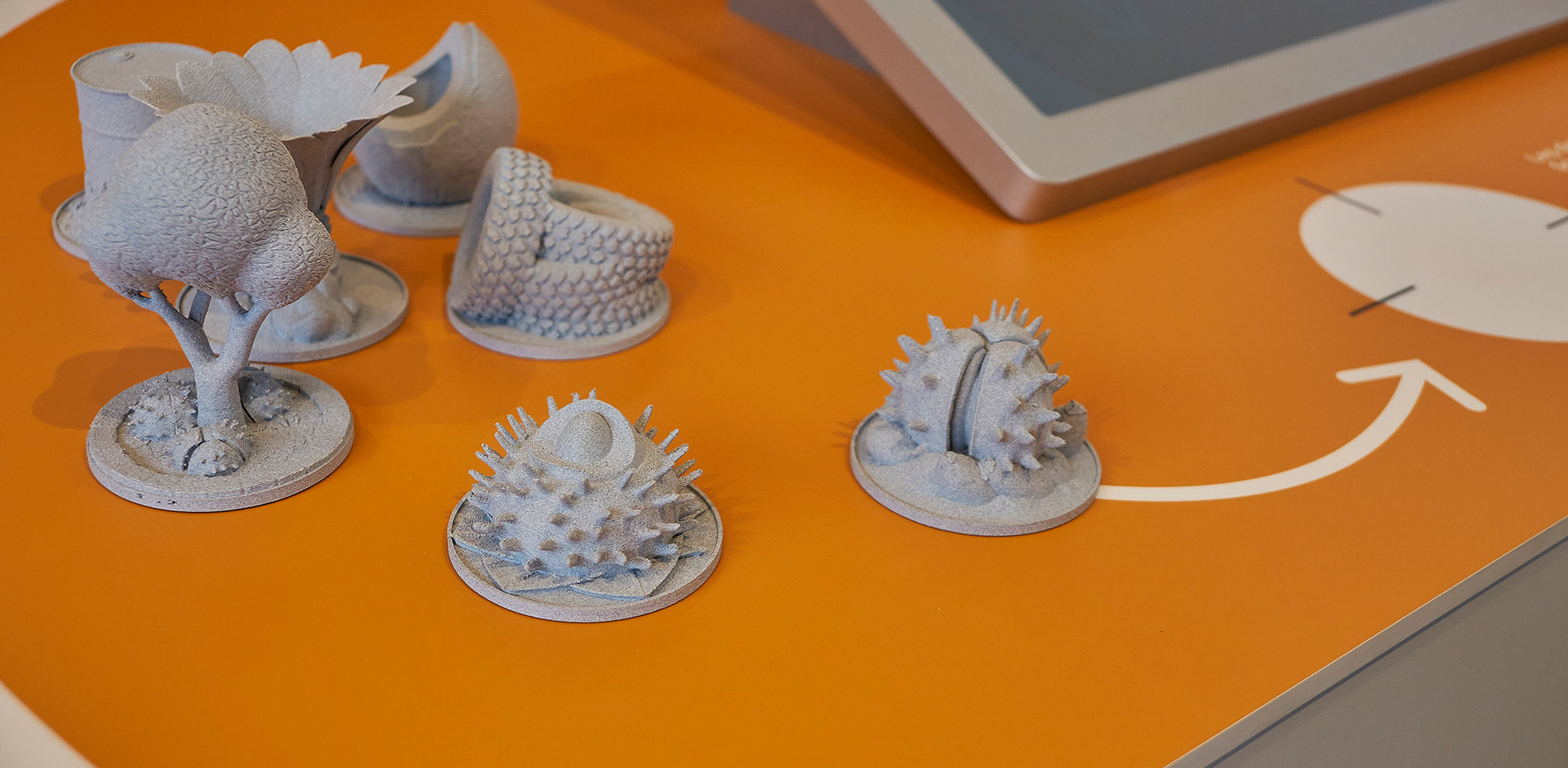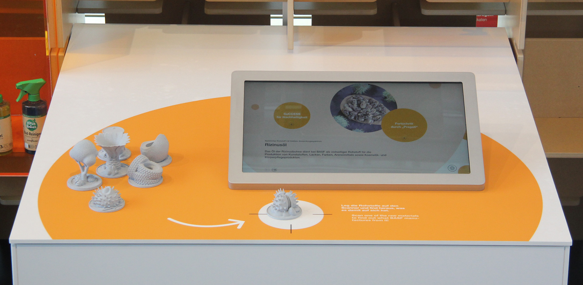 Das zweite Exponat veranschaulicht erneuerbare Rohstoffe mit gedruckten 3D-Objekten, die durch RFID-Chips und einen Scanner ergänzende Informationen öffnen. An den Wänden befinden sich Boards mit Texten, Grafiken und Schaubildern sowie Vitrinen mit exemplarischen Produkten und Materialien.