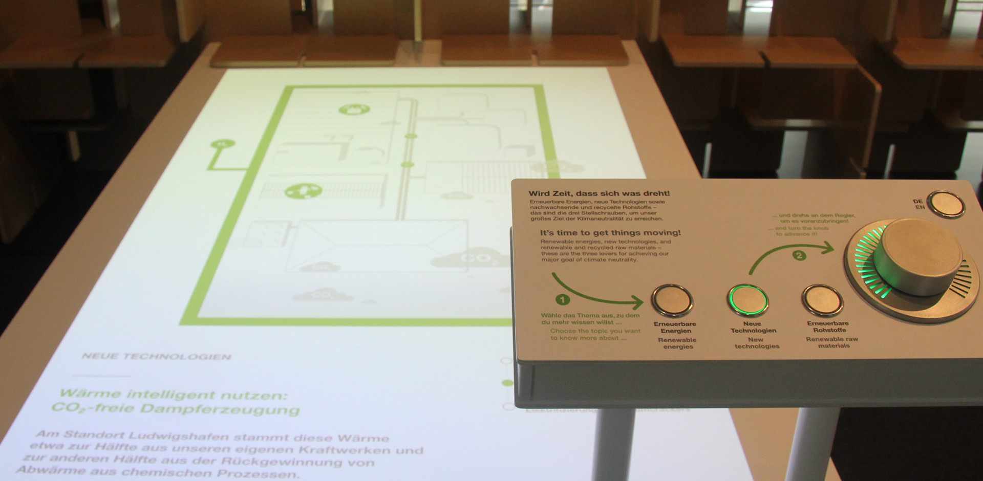 Die erste interaktive Station im Ausstellungsbereich widmet sich der Energietransformation. Besucher können mit einem Drehregler und Aufprojektionen verschiedene Entwicklungsstufen verfolgen und den Einfluss von erneuerbaren Energien und innovativen Technologien auf die CO2-neutrale Produktion bei BASF beobachten.